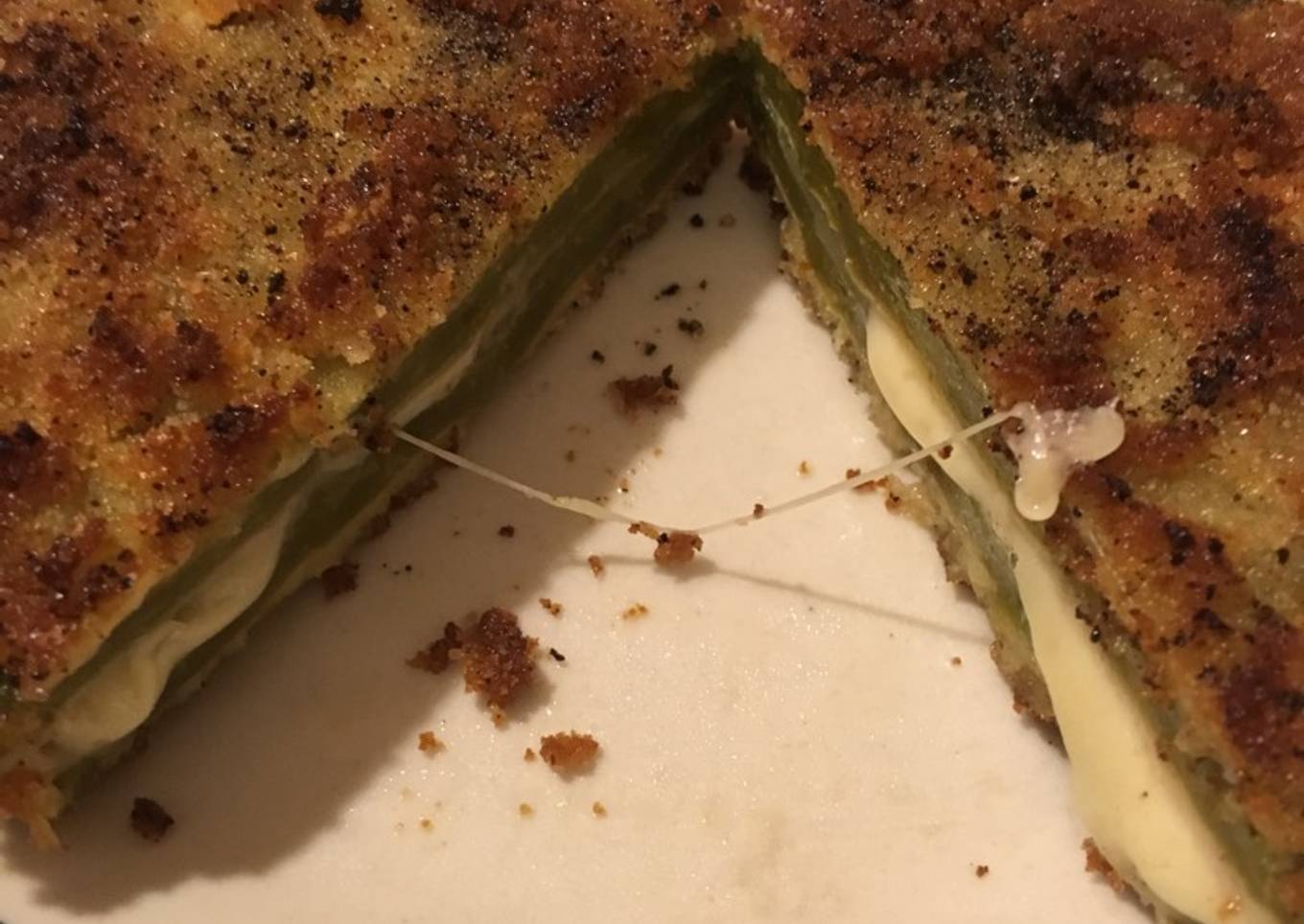 - A continuación vamos a formar una especie de sándwich. Para ello, colocamos un nopal, encima una loncha de jamón y un poco de quesillo deshebrado, procurando que ambos ingredientes queden dentro del perímetro del nopal. Tapamos con otro nopal, y aseguramos todo con uno o dos palillos. Repetimos el mismo proceso para preparar 8 piezas.
