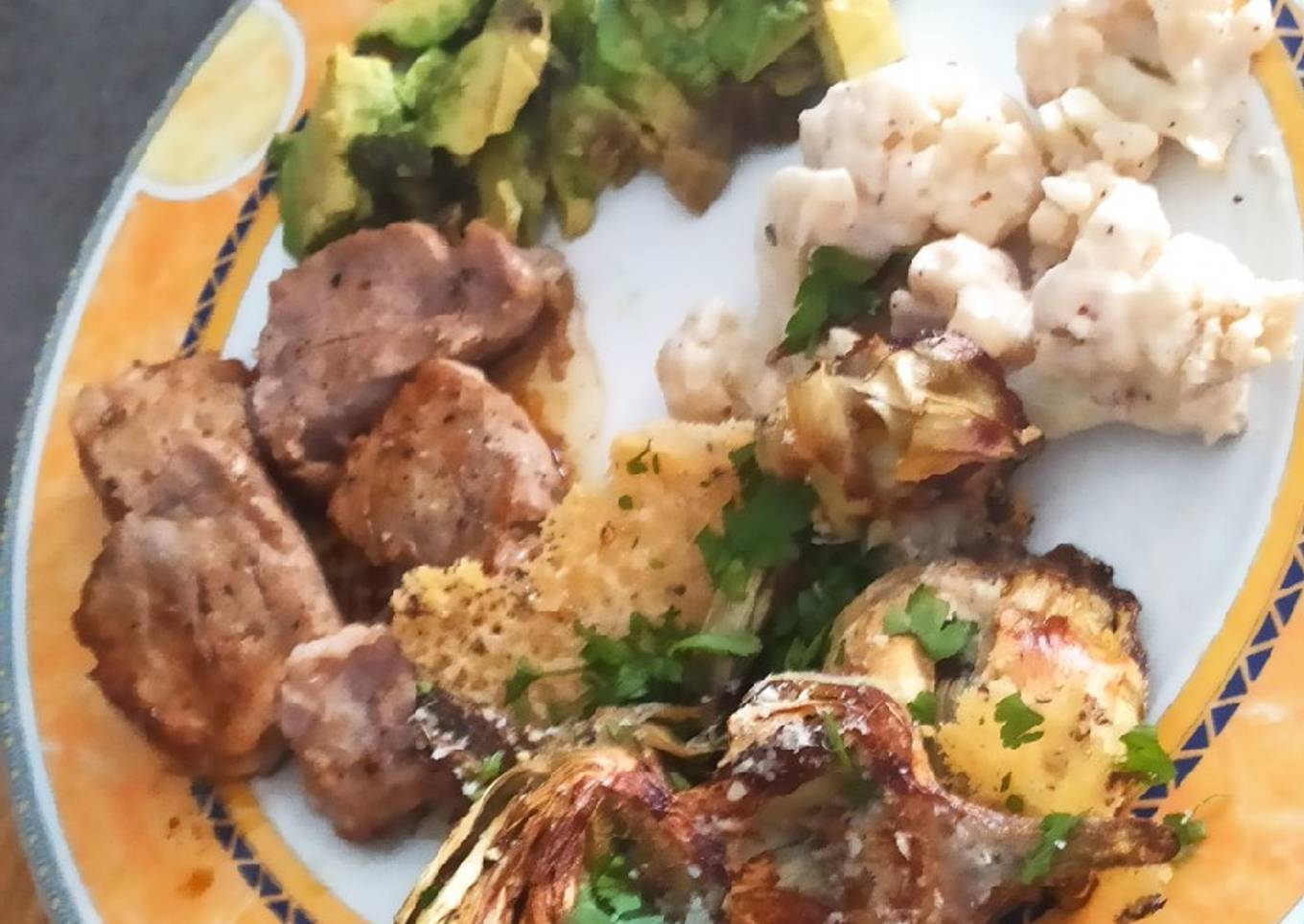 Steps to make to make Keto, Solomillo, crujiente de Alcachofa, coliflor y aguacate