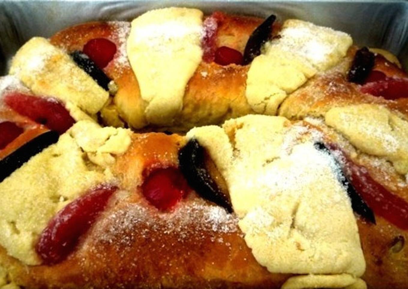 - Salpica con azúcar adicional encima de los costrones Salpica levemente con azúcar la rosca.