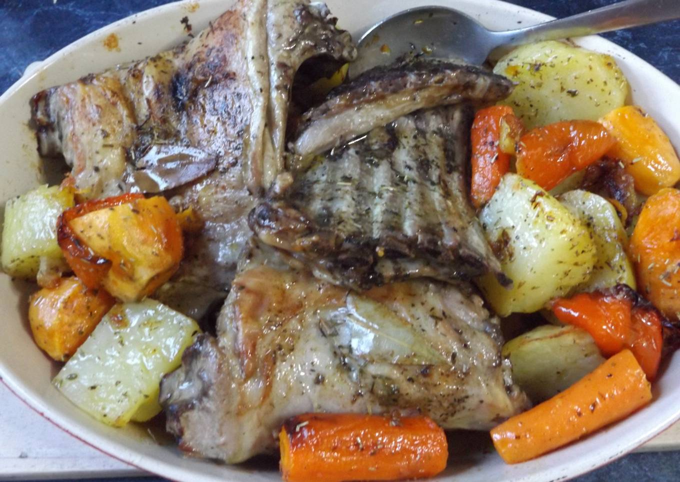 Asado de cordero al horno con patatas, zanahorias y batatas