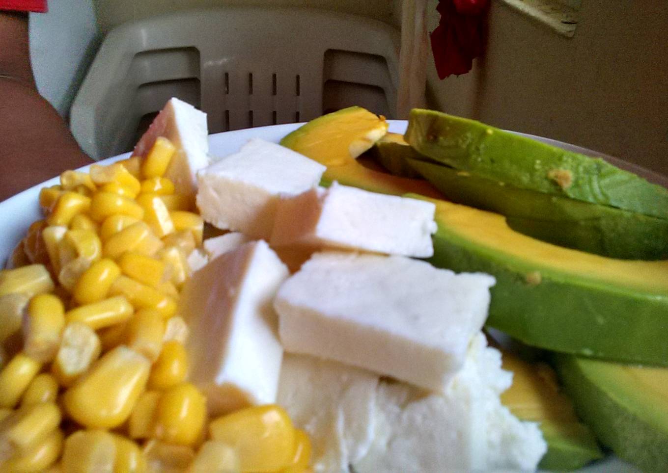 - En un plato colocar el aguacate y agregar sal , vinagre blanco de manzana y aceite de olivaal gusto,luego agregar el maíz dulce y el queso crema.