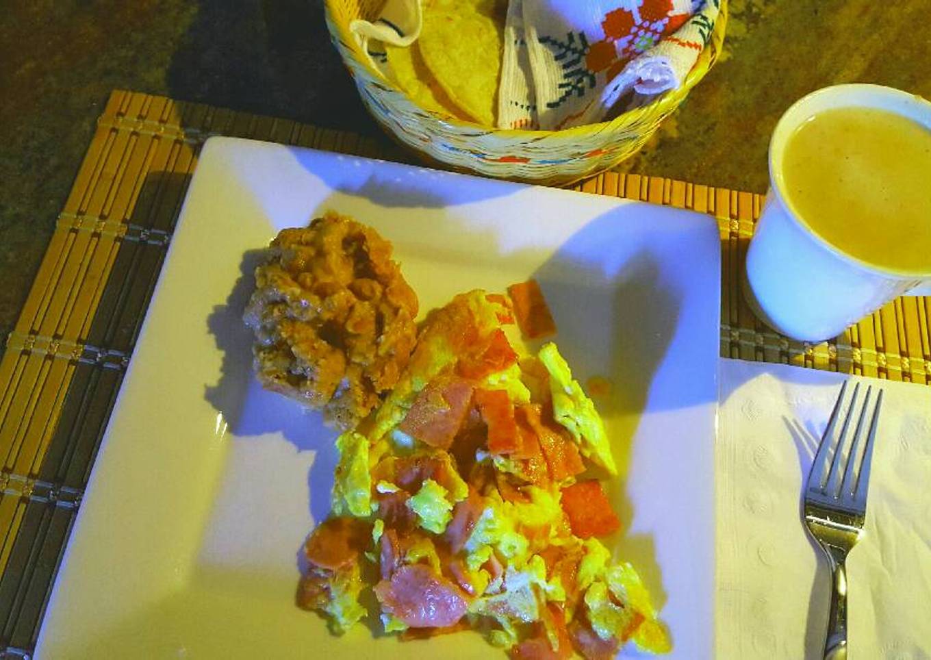 Hoy mi hijo está en casa, no hubo clases para él. Así de que lo consentí..., bueno, nos consentimos. Él quiso una torta de huevo con jamón y yo con unos frijolitos. Por supuesto que no podía faltar un rico champurrado!!!!