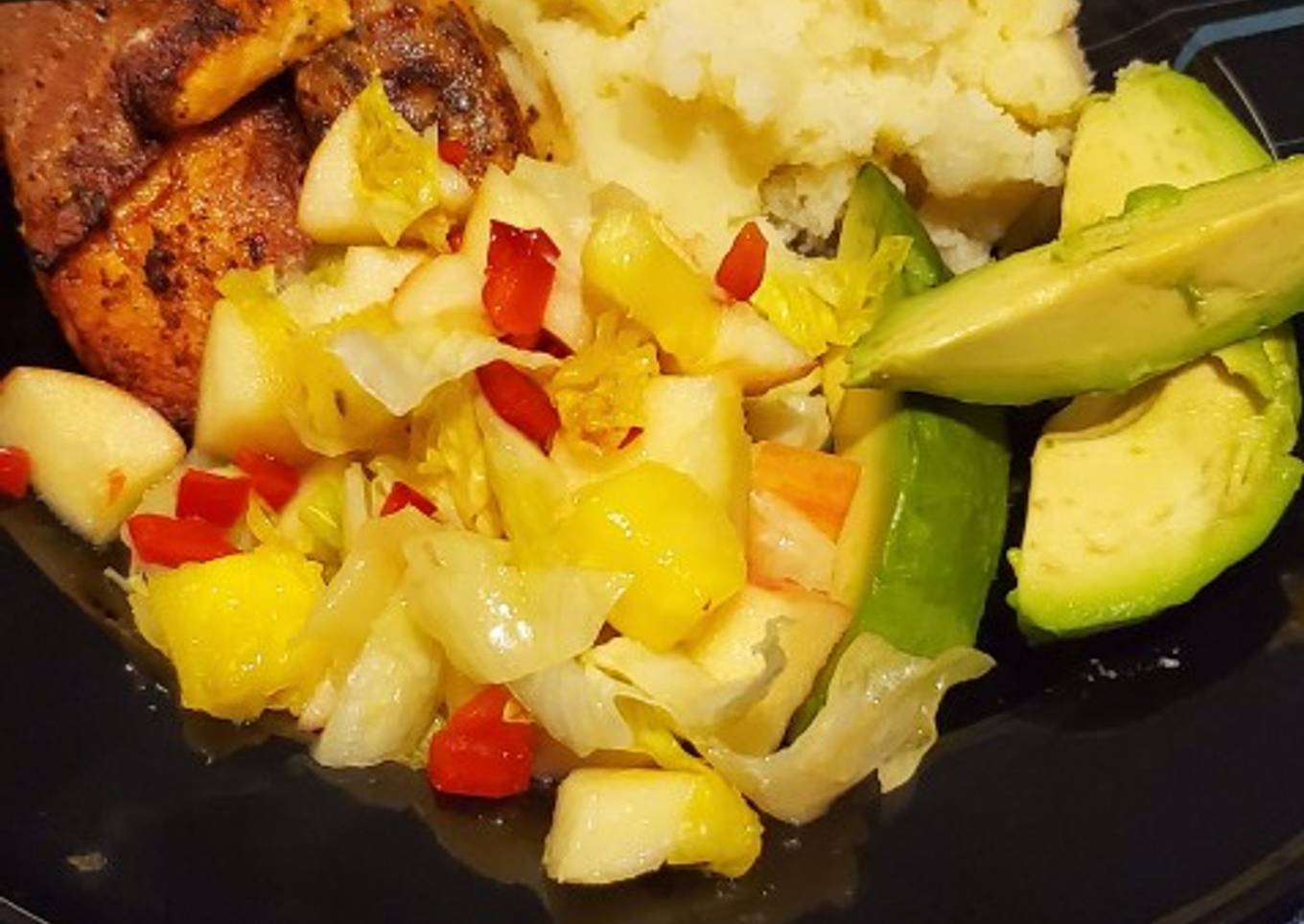 - Pique la lechuga, manzana pi帽a y aj铆 y lo vert铆 en el bol, le agregue el jugo de un lim贸n y sal y aceite de Oliva al gusto.
