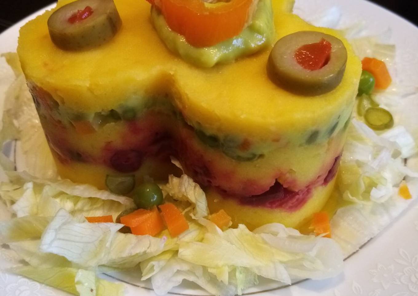 - Puedes hacer una presentación personal o puedes hacer la causa en un pyrex o mejor si es en un molde que te permita voltear la causa para que te quede como una torta. El cualquiera de los casos, iras poniendo una capa de causa, una capa de verduras y así terminando en tapa de causa
