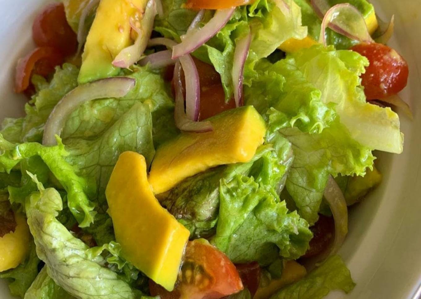- Mezclar los vegetales, aguacate, cebolla, lechuga, y tomate, y luego agregar sal, pimienta, zumo de limΓ³n, y aceite de oliva., revolver bien para integrar los ingredientes y listo a disfrutar!!!!