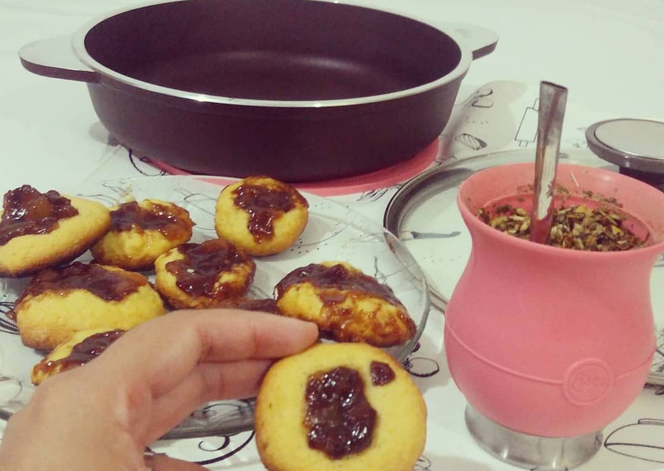- Realizar un hueco en el centro de cada pepa con la ayuda de la yema del dedo y colocar una cucharadita de dulce de batata con chocolate.