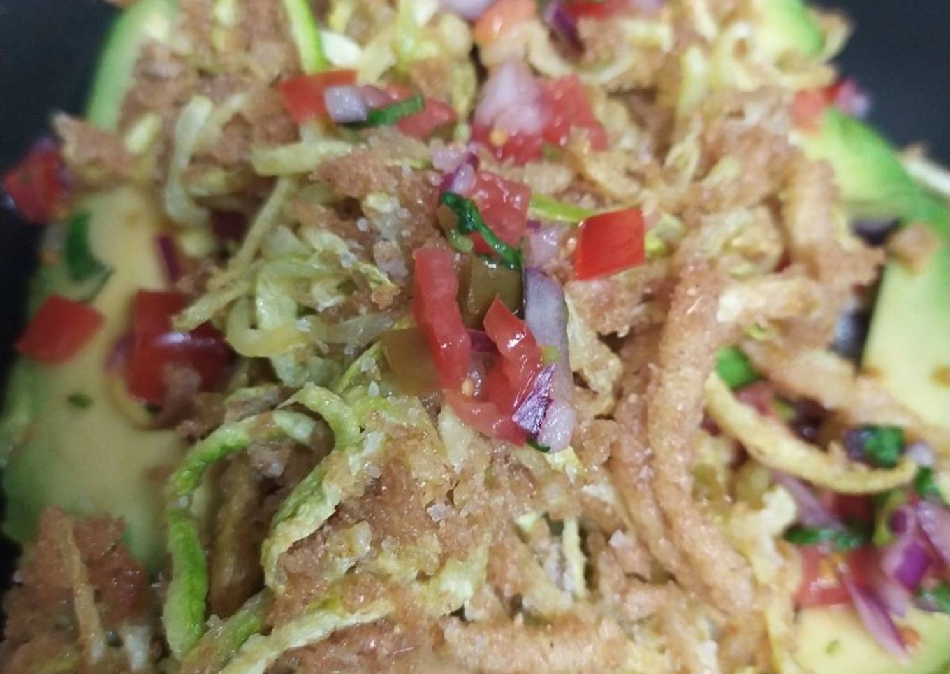 Pico de gallo con aguacate y spaghetti de calabacín enharinado