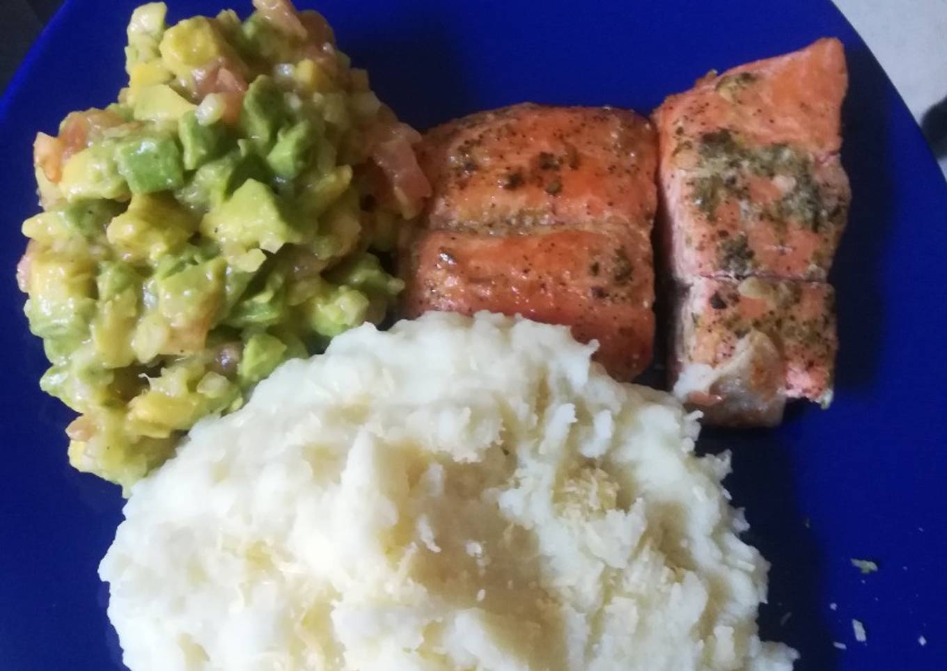 Salmón acompañado de puré de papas y ensalada de aguacate