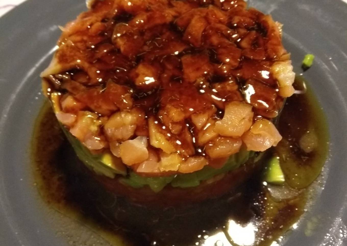 - Montamos el plato con un aro y ponemos la capa de tomate, la capa de aguacate y el salmón, quitamos el aro y añadimos la vinagreta por encima.