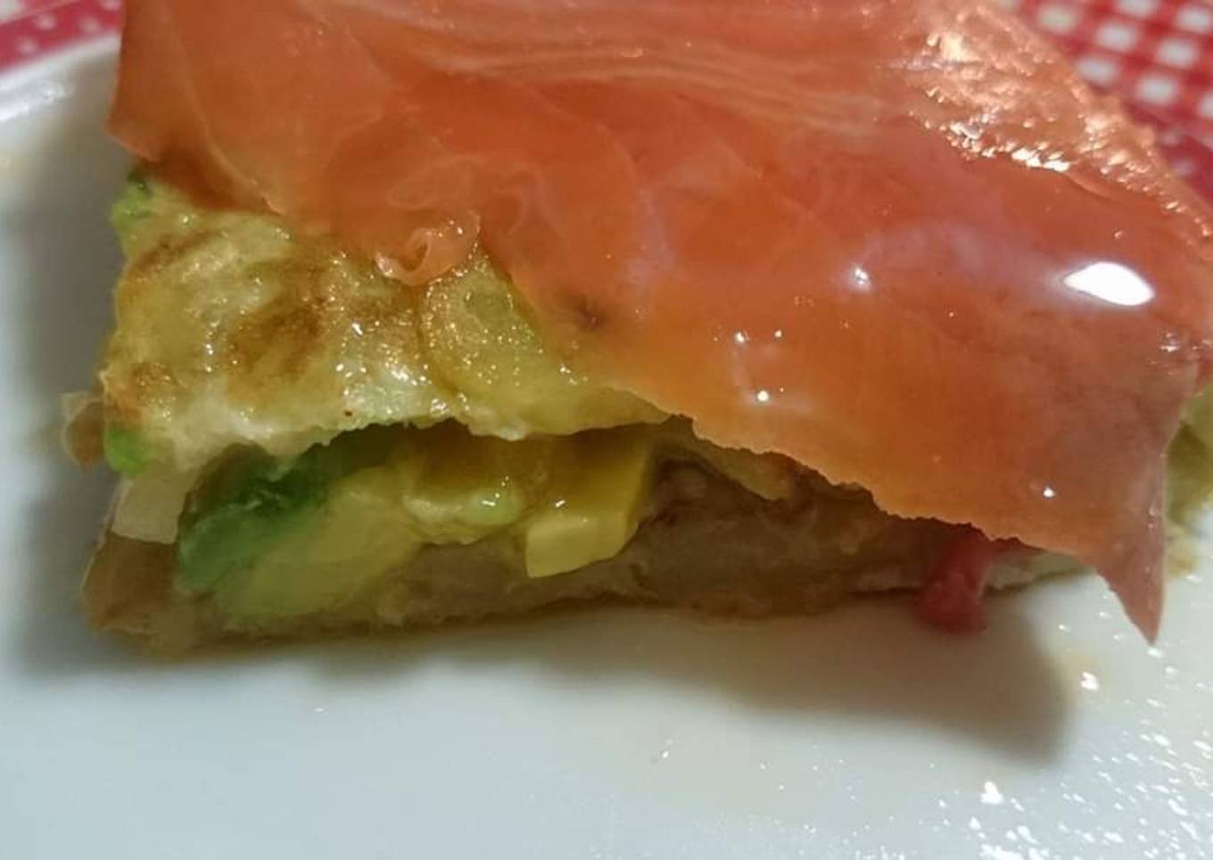 - Haces como una Tortilla de patata normal y le añades aguacate y luego cuando esté la tortilla de patata hecha le pones por encima salmón ahumado.