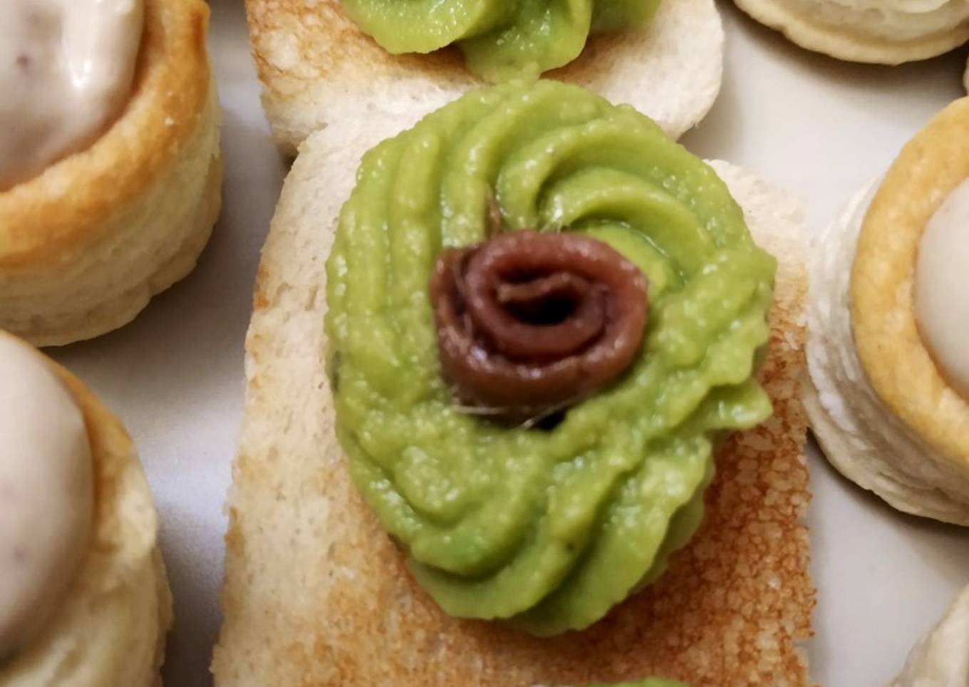 - Disponemos una banda de guacamole en la tosta y ponemos una anchoa a lo largo.