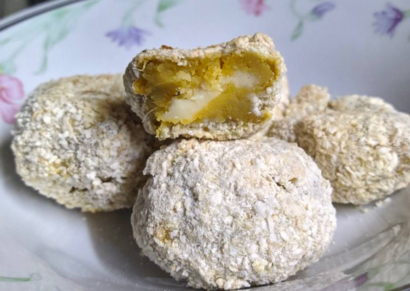 - Pelar y hervir 2 Batatas Medianas para luego hacerlas puré y reservar. Una vez que el puré esté frío o tibio como para manipular, formar bolitas, colocar el queso cremoso cortado en cubitos en el centro y cerrar. Luego pasar por pan rallado.