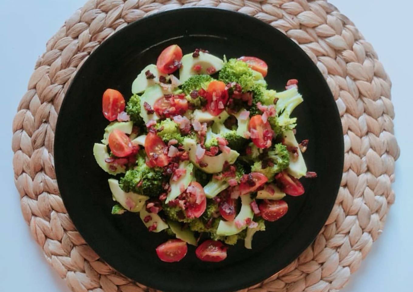 Ensalada de brócoli, aguacate, tomate cherry y bacon crujiente