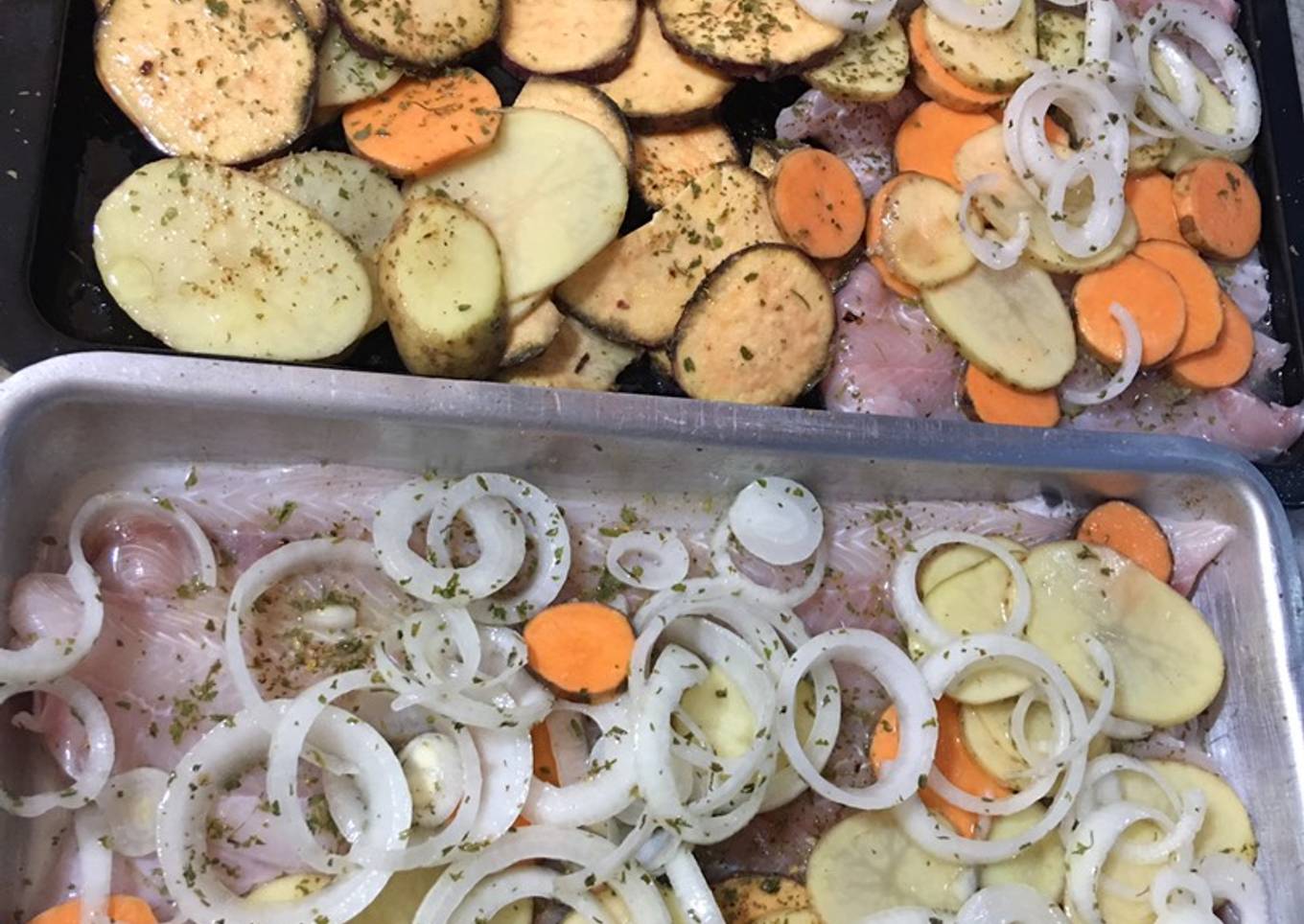- Acomodar filet en bandejas aceitadas, cortar en rodajas finas las verduras