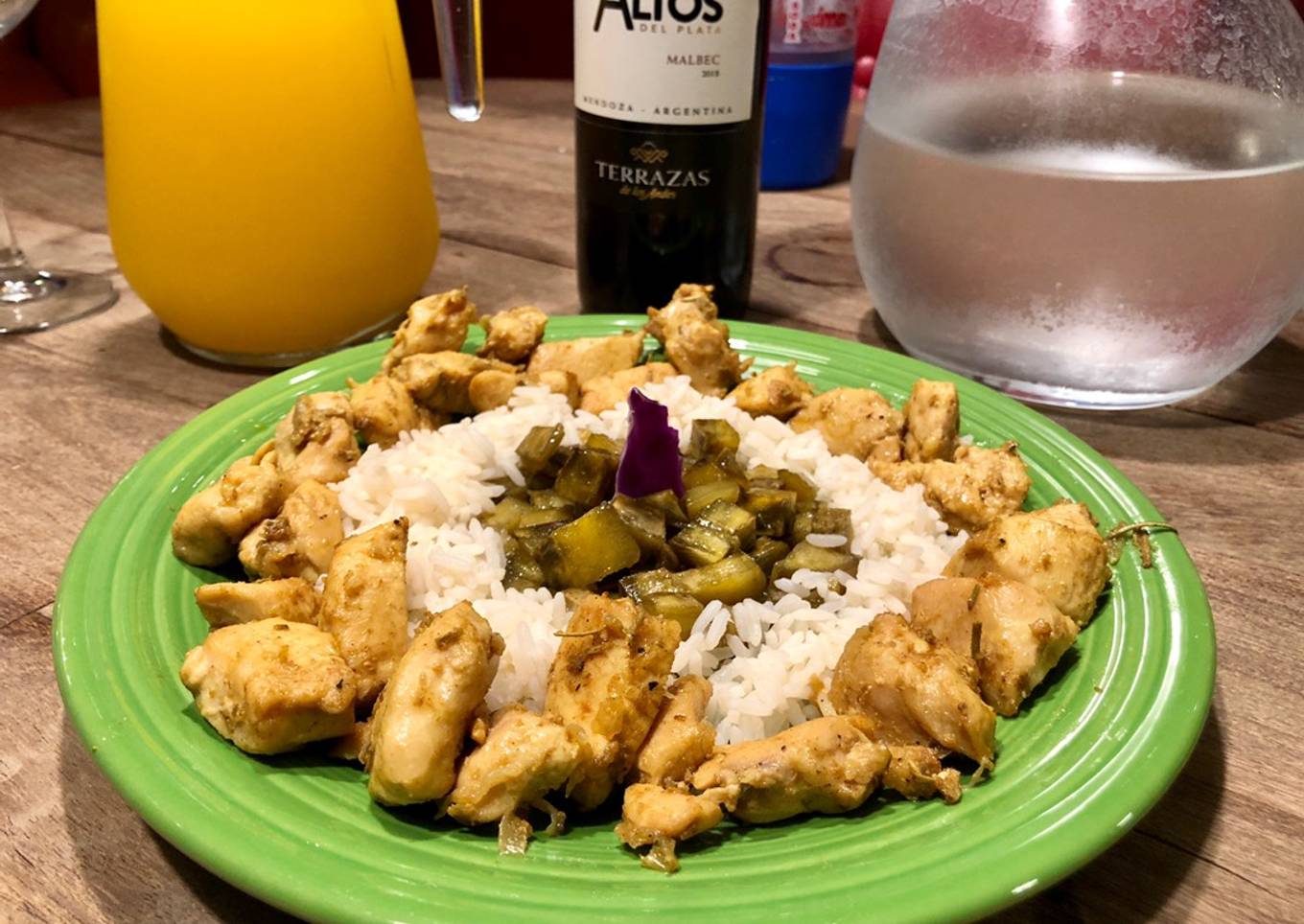 Inolvidable pollo al curry con batatas en almíbar y arroz