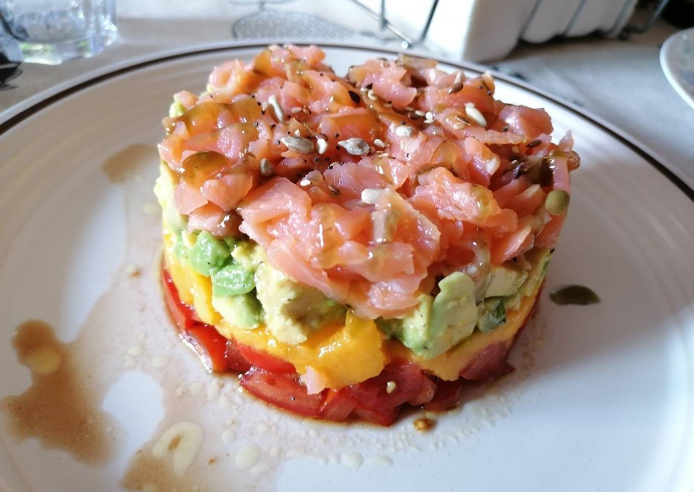 - Montamos el tartar utilizando un molde: primero el tomate, después el mango, después el aguacate y por último el salmón. Mezclamos en un vasito un buen chorro de aceite y un buen chorro de vinagre de Módena, mezclamos y lo añadimos por encima. Puedes añadir también un chorrito de vinagre de manzana y unas semillas