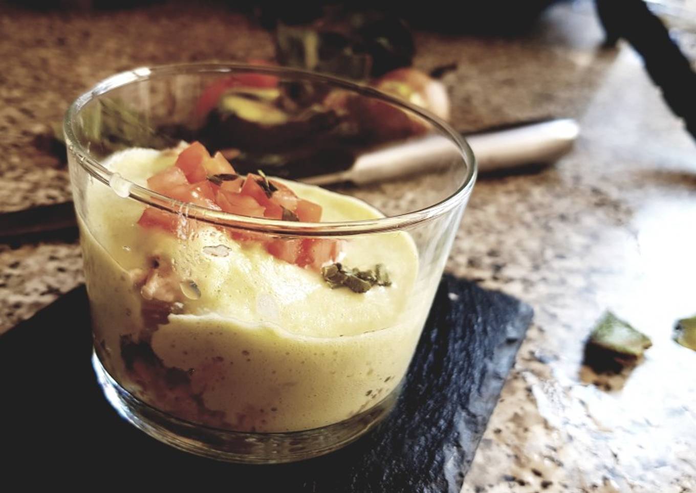 - Repartimos la crema de aguacate en los vasos, cubriendo el atún y acabamos con unos dados de tomate. Sazonamos con un poco de sal y de pimienta blanca y repartimos el cebollino por encima. Super suave. Un buen entrante