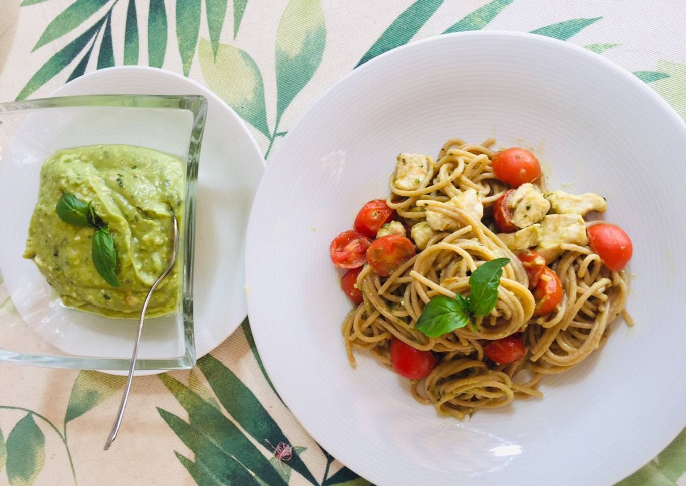 Espaguetis integrales con pesto de aguacate, pollo y cherrys confitados