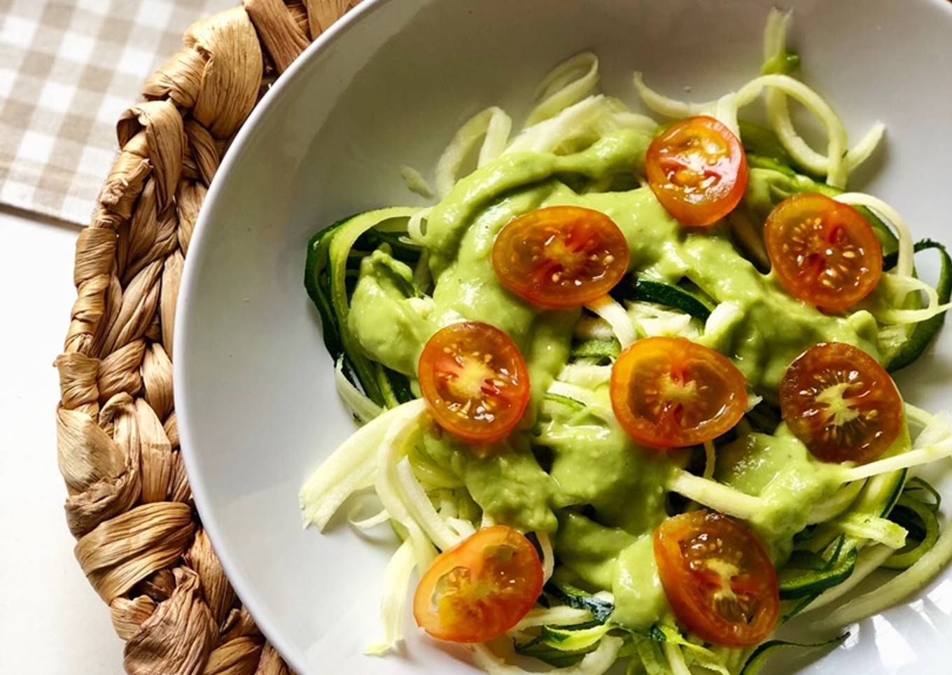 Noodles de calabacín con salsa de aguacate y tomates chery